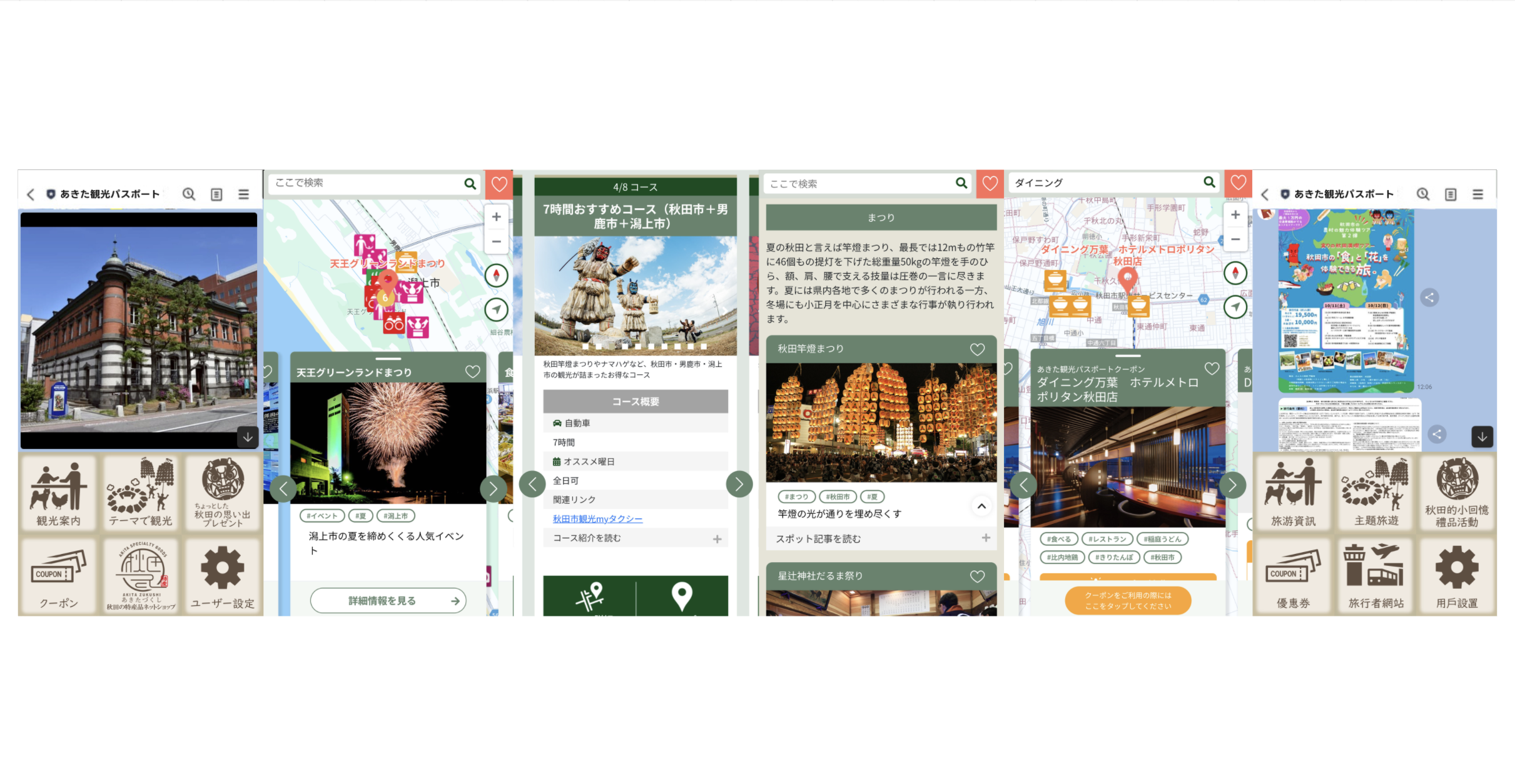 秋田市、男鹿市、潟上市が運営する「あきた観光パスポート」では、観光情報や観光マップ、飲食クーポン、イベント情報などのお得で便利な機能が満載で、ECサイトやふるさと納税サイトにアクセスし、地域の特産品を購入することが可能です。 友だち登録者増加のため、3市のイベント・まつり会場の抽選会でノベルティグッズの進呈、首都圏や市内イベント等でのPR活動、クーポン登録店舗および市内一部ホテル客室へのPOPの設置などを実施しました。現在の登録者は8,990名です。